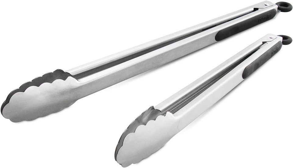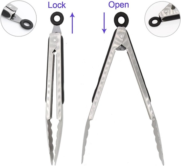 304 Stainless Steel Kitchen Cooking Tongs, 12" and 14" Set of 2 Strong BBQ Brushed Locking Food Tongs, Black
