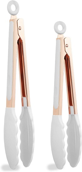 Stainless Steel Silicone Tip Kitchen Food Grilling and Cooking Tongs Set of Two for Nonstick Cookware, Grilling Tongs, Rose Gold and White 9" and 12"