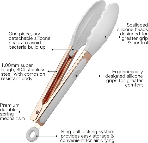 • Food contact safe and designed with your safety in mind to prevent burns and avoid germs. Features a firm locking feature that is user friendly, simply pull the secure locking ring outwards and hang from the loop for storage.