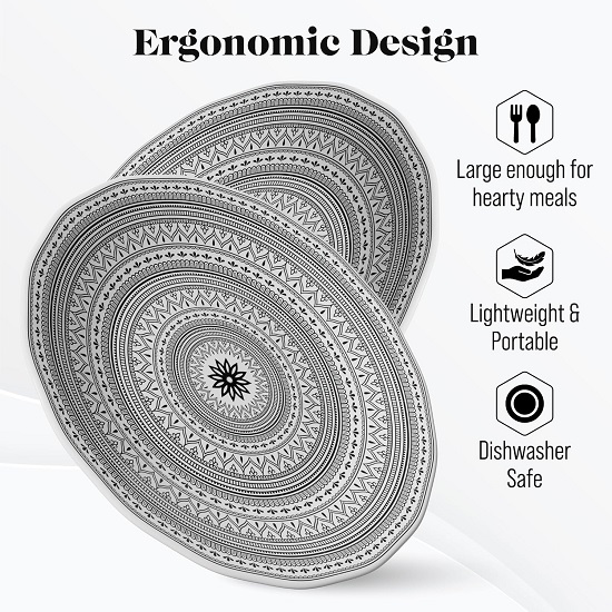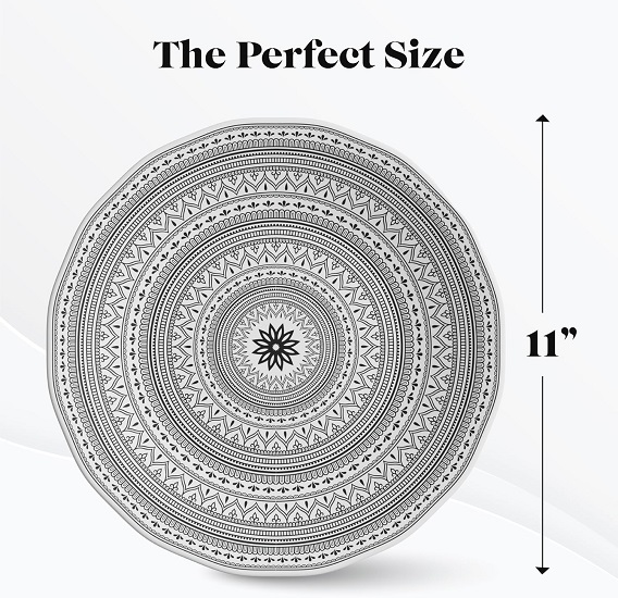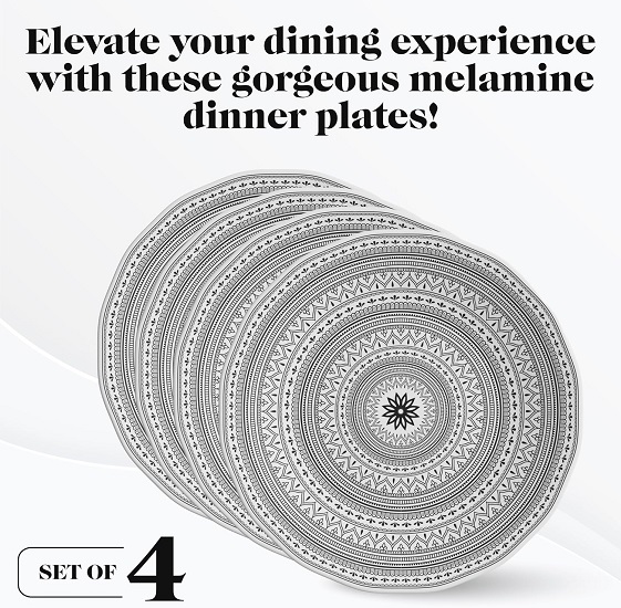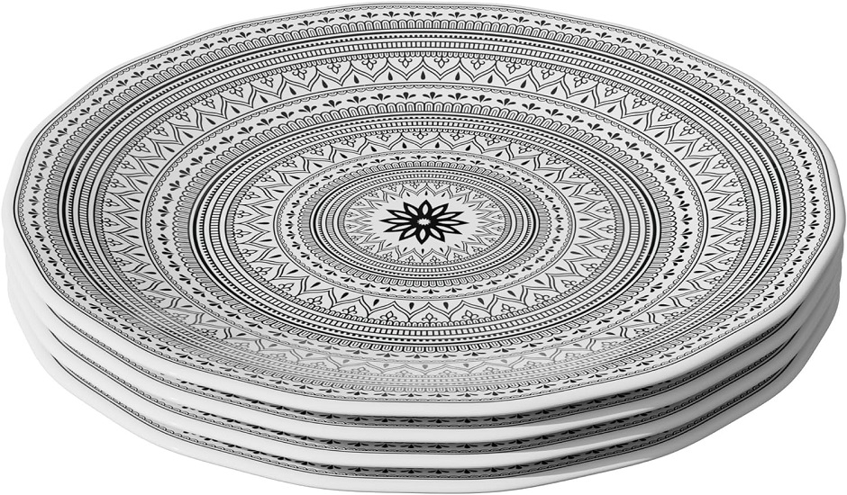 Melamine Plates, 11-Inch Lightweight and Break-Resistant Dinner Plates, Moroccan Black/White Design, Set Of 4