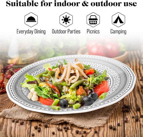 • Indoor & Outdoor Use: Perfect for everyday dining and casual entertaining, outdoor parties and barbecues, poolside dining, patio entertaining, also a choice for picnic, camping, travel trailer, motorhome, RV, and camper - without worrying about breakage and chipping.